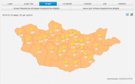 Ус, цаг уур орчны шинжилгээний хүрээлэнгээс ирүүлсэн өнөөдрийн 20.00 цаг хүртэлх цаг агаарын урьдчилсан төлвийг танилцуулж байна. Өнөөдрөөс нутгийн ихэнх хэсгээр бага зэрэг хүйтрэх төлөвтэй байна. 2019 оны нэгдүгээр сарын 19-ний 08.00 цагаас 20.00 цаг хүртэлх цаг агаарын урьдчилсан ...