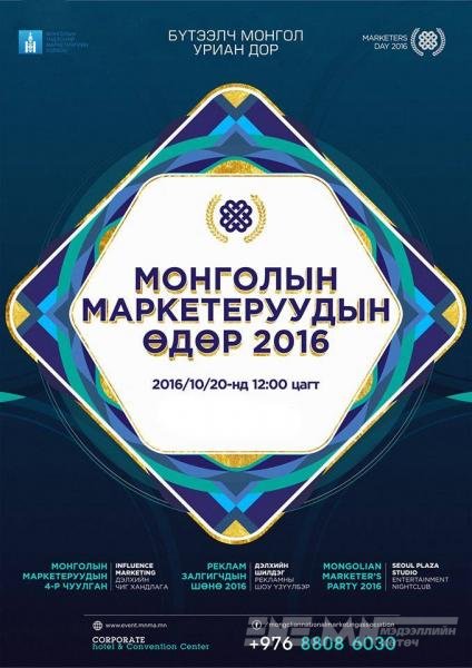 Монголын Үндэсний Маркетингийн Холбооноос энэ өдрийн хүрээнд "Маркетеруудын чуулган”-ыг зохион байгуулдаг бөгөөд өдгөө дөрөв дэх удаагийнхаа чуулганыг өнөөдөр эхлүүлэхэд бэлэн болжээ.