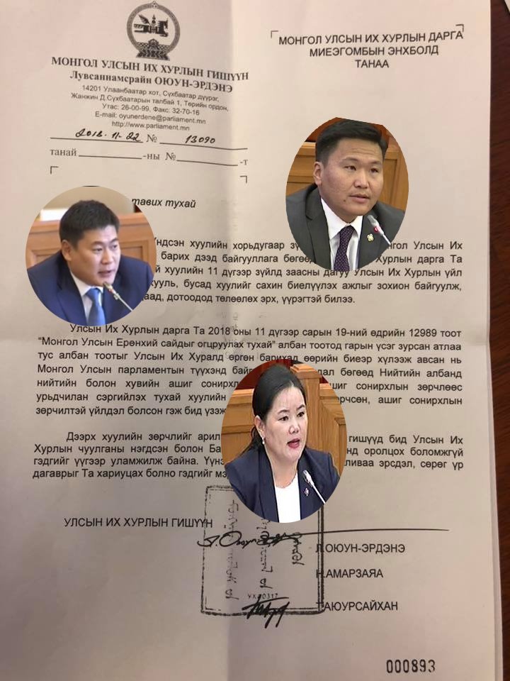 УИХ-ын гишүүн Л.Оюун-Эрдэнэ, Н.Амарзаяа, Т.Аюурсайхан нар ангийн даргаа буюу УИХ-ын дарга М.Энхболдыг огцруулах бичиг өргөн барилаа хэмээн шуугиулсан.