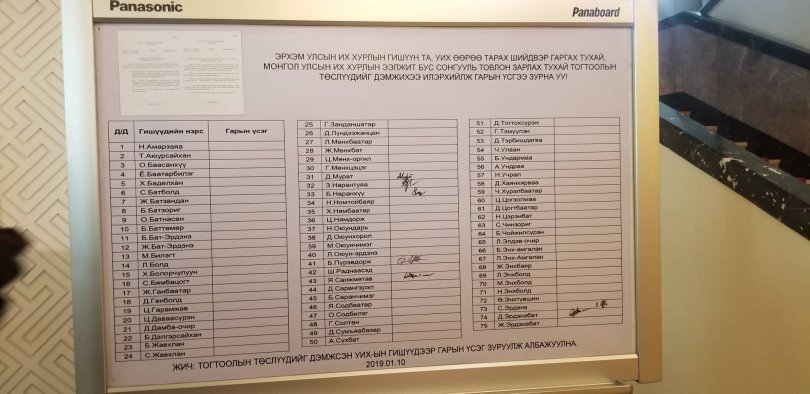 Өнгөрөгч аравнаас эхлэн төрийн ордонд байрлуулаад буй УИХ-ыг нэн яаралтай тарааж, ээлжит бус сонгууль зарлах тогтоолын төслийг дэмжиж буйгаа илэрхийлэх самбарт Ж.Эрдэнэбат, Г.Тэмүүлэн гишүүн гарын үсэг зурлаа. Ингэснээр уг тогтоолын төслийг дэмжиж гарын үсэг зурсан гишүүн 14 болж байна.