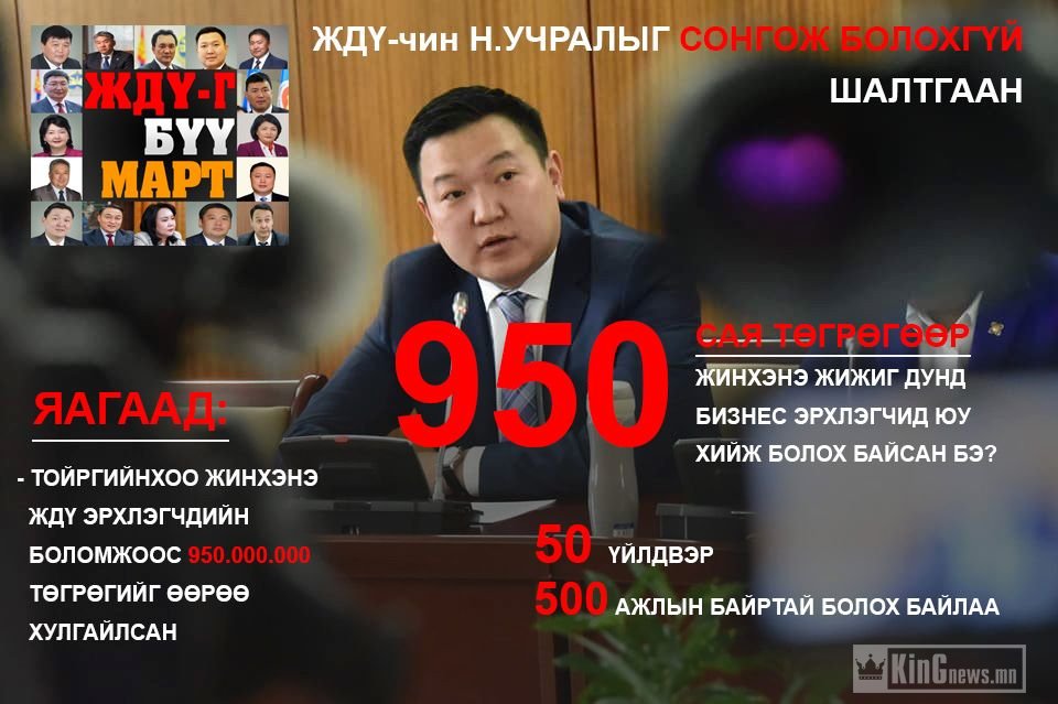Тэрээр энэ талаар хэлэхдээ "Би ЖДҮ-гээс зээл аваагүй. Манай аав Ням-Осорын авсан 950 сая төгрөгийн зээлийг би өмнөөс нь төлчихье" гэж хэгжүүрхэн байж төлж орхисон нь авсан гэдгээ давхар нотолсон хэрэг. Гэтэл ЖДҮ авсан УИХ гишүүн Ж.Энхбаяр нэр дэвшихээс татгалзаж жудгаа харуулсан. Жудаг харуулахдаа бус уг нь төрд өндөр албан тушаал хашиж буй ямар ч хүн албан тушаалаа урвуулан ашиглаж болдоггүй гэдгийг Н.Учрал гишүүн мэдэж л байх учиртай.