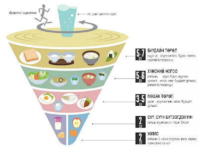 Хэдэн зуун жилийн өмнөх шиг өдөржин мал дагаж, хөдөө хөхөрч гадаа гандаж, байгаль цаг ууртай шууд харьцаж амьдардаг хэвшил аль хэдийн өөрчлөгдөж паартай байшинд сууж суурьшмал амьдралд шилжээд хэдэн үеийг өнгөрөөж байхад монгол улс эрс тэс, хүйтэн уур амьсгалтай орон учир мах, өөх тос голлосон хоол идэх ёстой ойлголт гэдэг ойлголт аль хэдийн хуучирчээ. Халуун дулаан газрын хүмүүс шиг үргэлж будаа, загас идээд байдаггүй юмаа гэхэд өдөр бүр идэх хоолныхоо илчлэгийг ойролцоогоор тооцчихдог, ногоо, махныхаа харьцааг тохируулаад сурчихвал эрүүл амьдарч, урт наслахад хэн бүхэнд хэрэгтэй юм. Ингээд япон улсын Эрүүл мэнд, хөдөлмөр нийгмийн халамжын яам, Хөдөө аж ахуй, ой загас агнуурын яамтай хамтран 2-3 жил тутамд шинэчлэн гаргадаг Зохистой хооллолтын зөвлөмж (食事バランスガイド)-ийг орчуулан хүргэж байна.