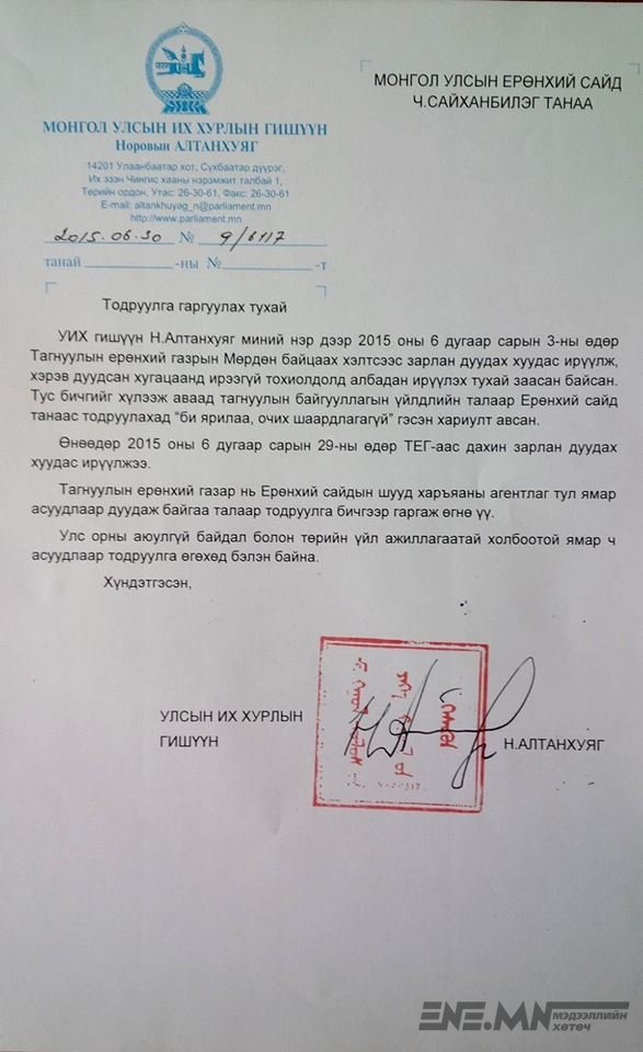 УИХ-ын гишүүн Н.Алтанхуягийг тагнуулын байгууллагаас дууджээ. Түүнийг хуулийн хугацаанд ирж, байцаалт өгөхийг хүссэн байна. Тэгвэл тэрбээр энэ дагуу Ерөнхий сайд Ч.Сайханбилэгт хандаж, тодруулга хүссэн байна.